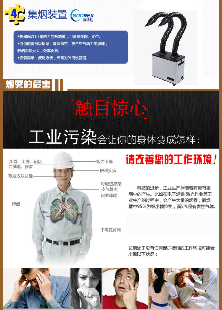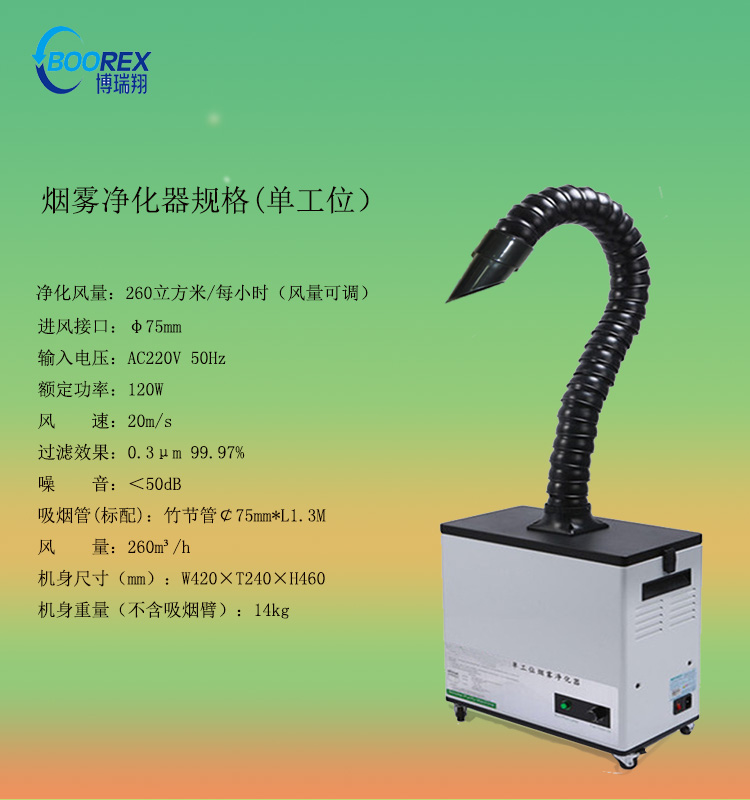 ◆機(jī)器配以萬(wàn)向吸煙臂,可隨意變向、定位(長(zhǎng)度可根據(jù)客戶(hù)要求定制)。端部裝以新型集煙罩,造型獨(dú)特,吸煙效率更高。